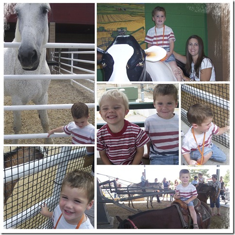 I learned I need a much faster camera in order to catch this busy little two year old in action.  He loved everything, feeding the big white horse, the baby goats, riding in the wagon with his buddy Sky and was even willing to wait in a very long line for 45 minutes for a pony ride.  We did have an embarrassing moment or two along the way, which has led me to wonder if it is better to be with friends or alone when your child does something embarrassing.  I still haven't decided, but if there is anyone else who would like to get out and do something fun with their less than perfectly behaved toddler, let me know.